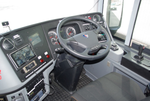 運転手の村尾さんに、「アストロメガ」についてうかがいました。「スカニア社のミッションを運転するのは初めてですが、操縦はしやすいですよ。クラッチペダルがなくて、扱いはフルオートマチックとあまり変わりません。ボディ、エンジン、シャーシに加えて、空調もドイツのエバースべッシャー社製。ほとんどの要素が海外製という、かなり珍しいバスなのではないでしょうか。いろんな国のいろんな会社が協力して、いいバスを作ることができたと思っています」
